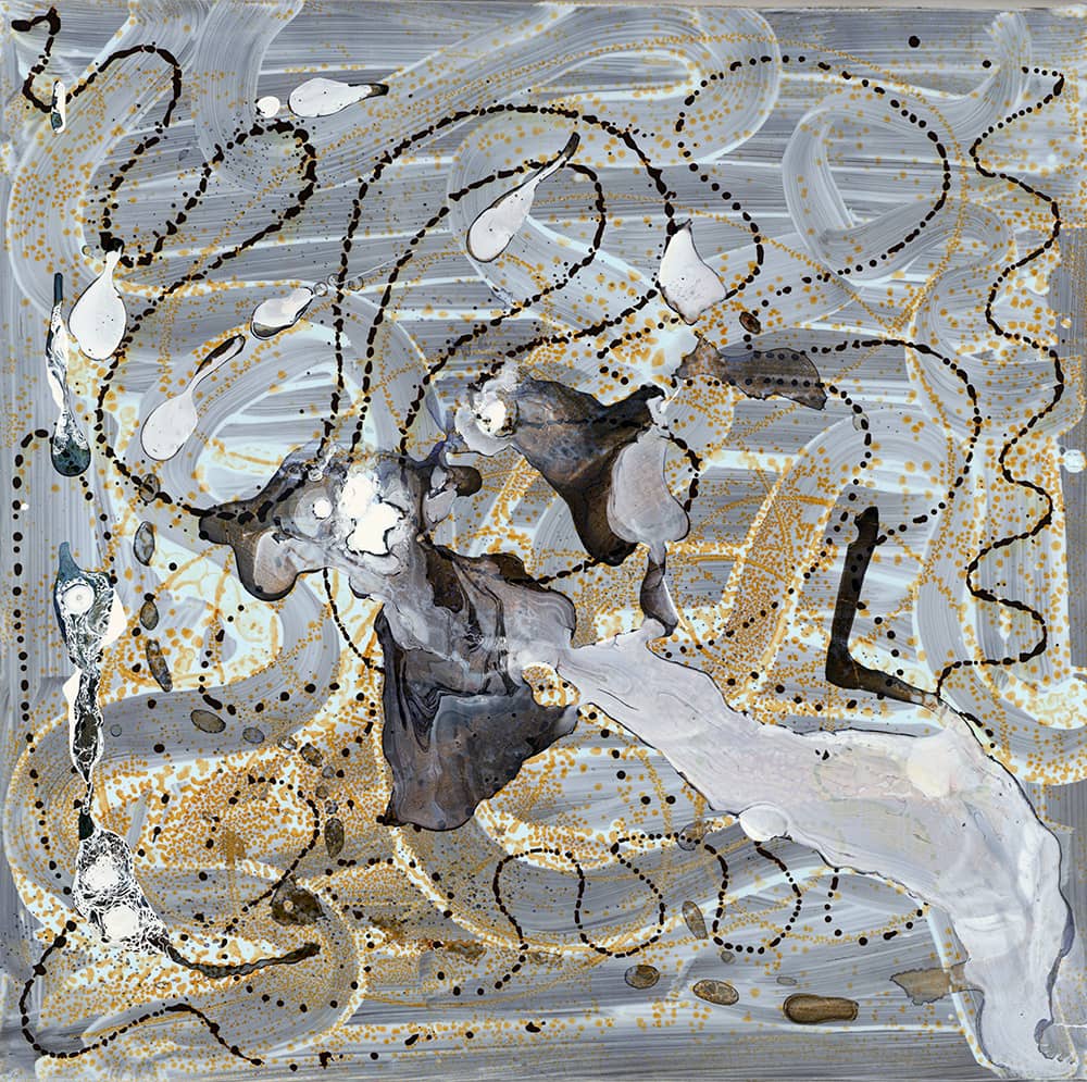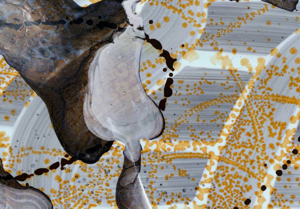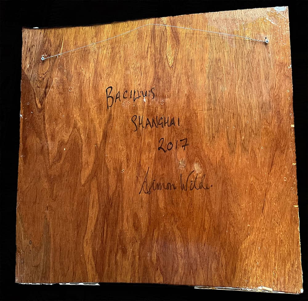 Bacillus represents the complex interplay of microscopic life. Its monochromatic colour scheme evokes the sterility of the laboratory and the clarity of water. These understated elements are in dramatic tension with the riotous and intricate patterns in rust and enamel. These patterns were intentionally caused by the artist provoking chemical reactions on the surface of the steel substrate during the creation of the work. Bacillus has been finished in a clear epoxy enamel, ensuring the durability and longevity of the artwork.