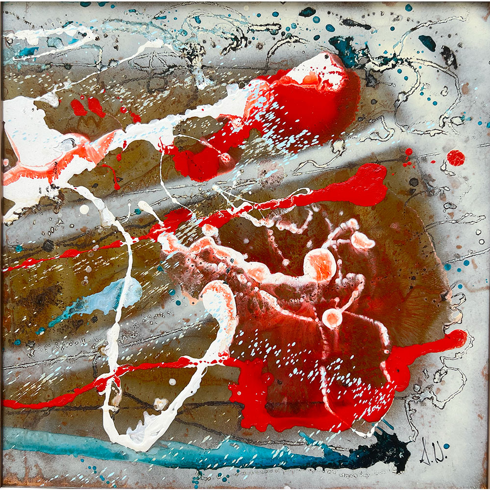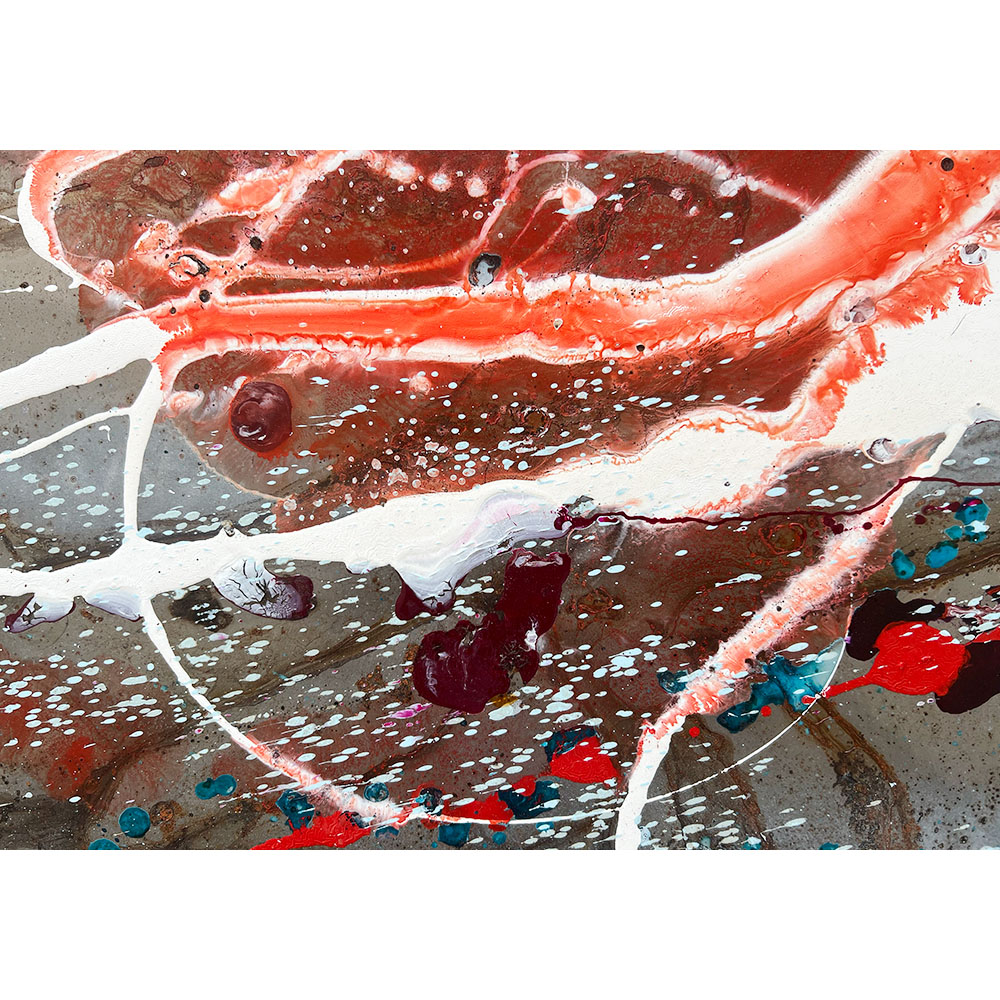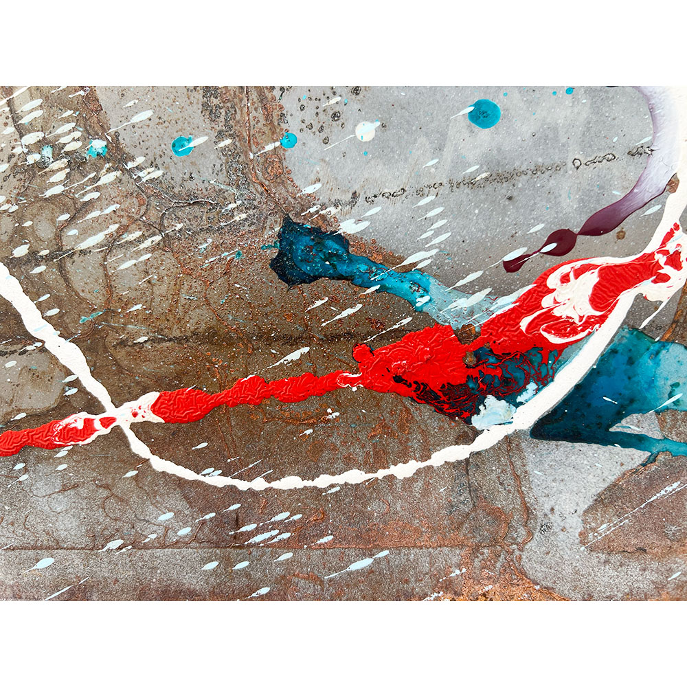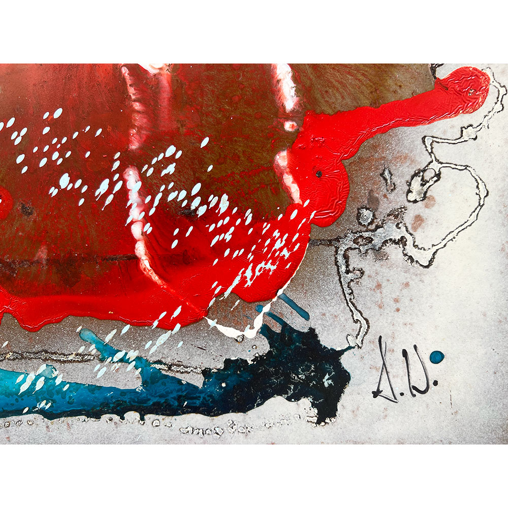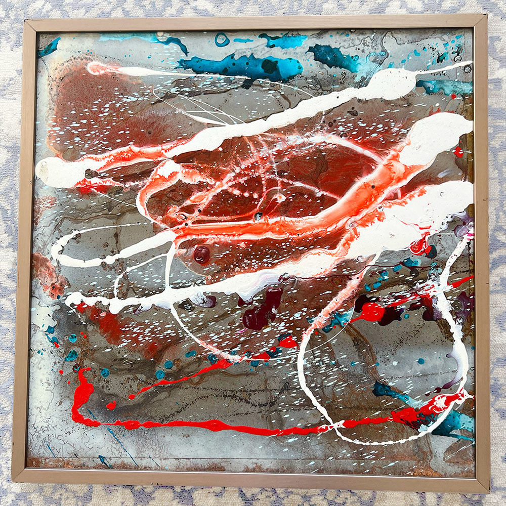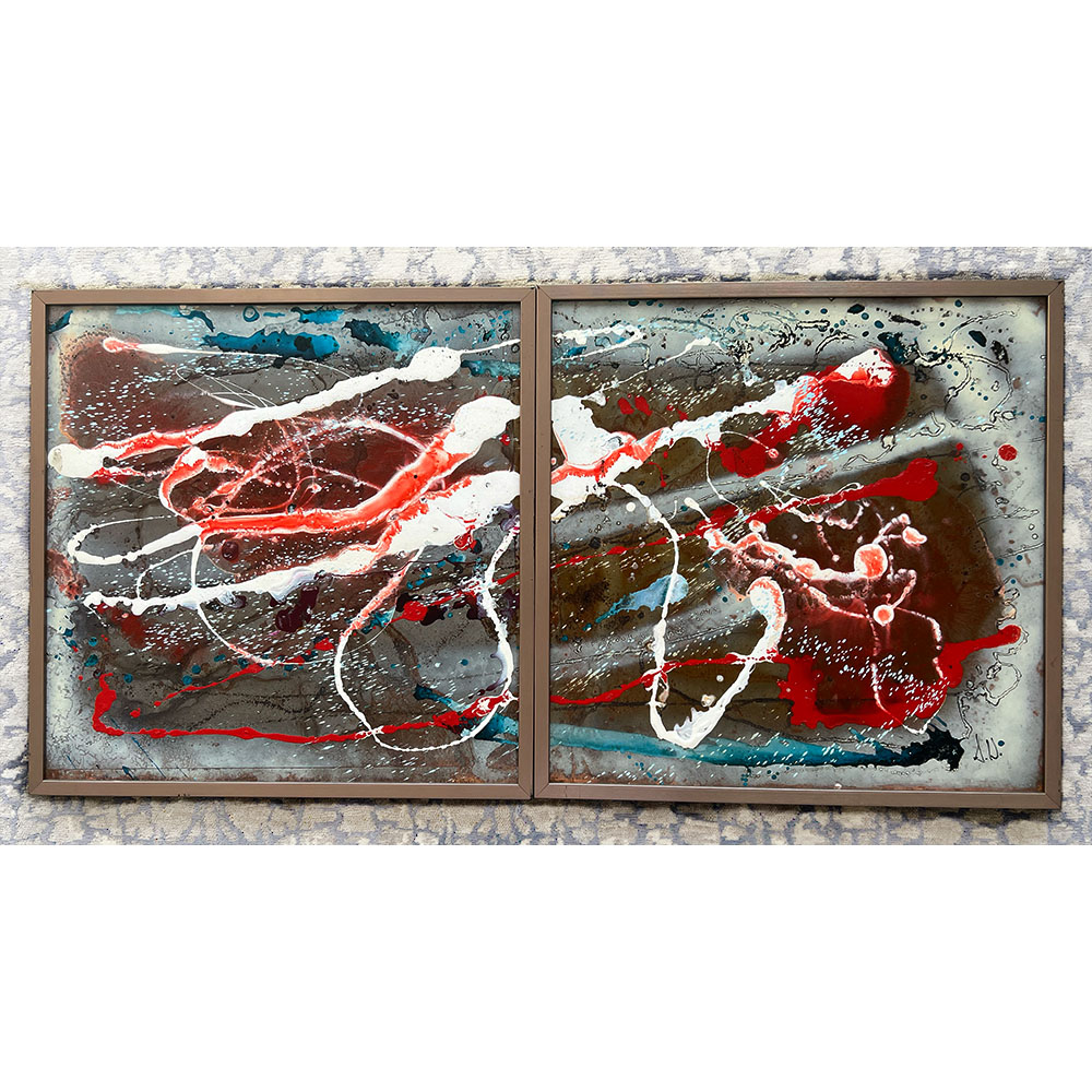 Named after the prehistoric super continent, Pangaea is composed of dramatic splashes of red and blue on a background of patterned rust. The dynamism and colour scheme of the work evokes the titanic geological forces at work on the surface of the earth deep in prehistoric time. Pangaea is a set of two which can be purchased together or separately. It has been professionally framed and comes with a certificate of authenticity.